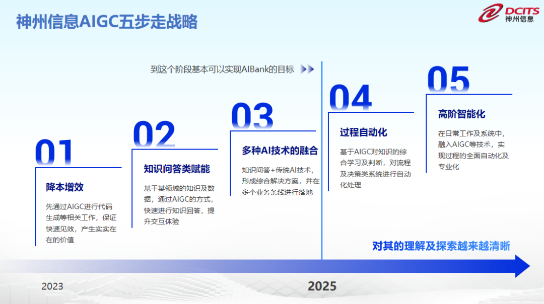 神州信息制定了 AIGC 五步走战略,并为此制定了发展路径图:以降本增效为起点,到多种AI技术的融合基本可以实现AI Bank的目标,最终达到高阶智能化和专业化的发展路径。